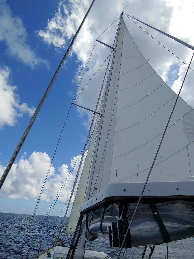 On the afternoon of the second day a squall formed near us and winds increased from 14 knots to 22 knots in just minutes.  We had most of our head sail out which was too much sail for those conditions especially since we weren’t sure if the winds would continue to increase.  Getting that big sail furled, in that much wind, was a real fight and by the time Russell got it in, we noticed some tears along the edge.  It looks as though the actual sail is fine, but the fabric UV protective strip will need to be repaired or replaced.  Either way, that means the sail will come down and the sewing machine will come out during our time in Grenada.