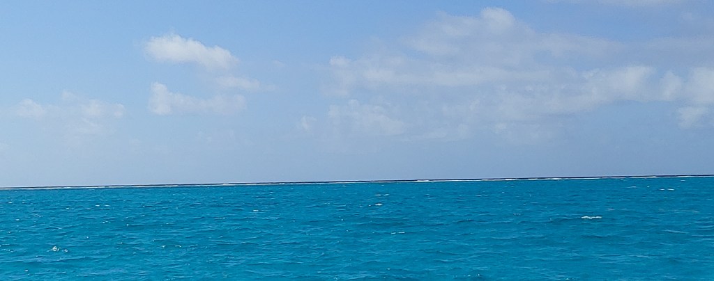 The anchorage at Abraham’s Bay was a little choppy but protected from large swells by the reef.  It is also absolutely beautiful and we were the only boat there!  The water is shallow and very clear.  We didn’t see a lot of sea life except for a few rays and some large barracuda which hung out by the boat and followed us around when we went swimming.