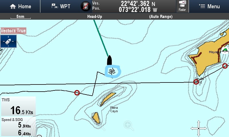 11:00 PM (5/31/19) My watch was to begin at midnight, but Janice awoke me early as we were approaching the Plana Cays and needed to tack to starboard. I wanted to be on watch for this maneuver and to pilot us through the pass knowing that the wind, waves, and current would be against us and it would be a rough ride. We tacked the boat to starboard and headed on a northeast course which would carry us back out to sea but also give the boat a better angle through the pass. Soon Janice was fast asleep on the aft deck on the bean bag, I didn’t awake her and went on deck and raised the “baby sail” (Staysail) to get a bit more boat speed from the wind. The ride was a bit more comfortable on this heading which put  the wind and seas a bit behind us and about six miles out I tacked back toward the Mayaguana Passage, but as I got closer to the pass the wind picked up beyond 20 kts with very rough sea conditions. The winds and current were pushing us onto the rock shoals east of the island, so I again decide to tack back out to sea to gain even more distance and angle for this now quite challenging pass.