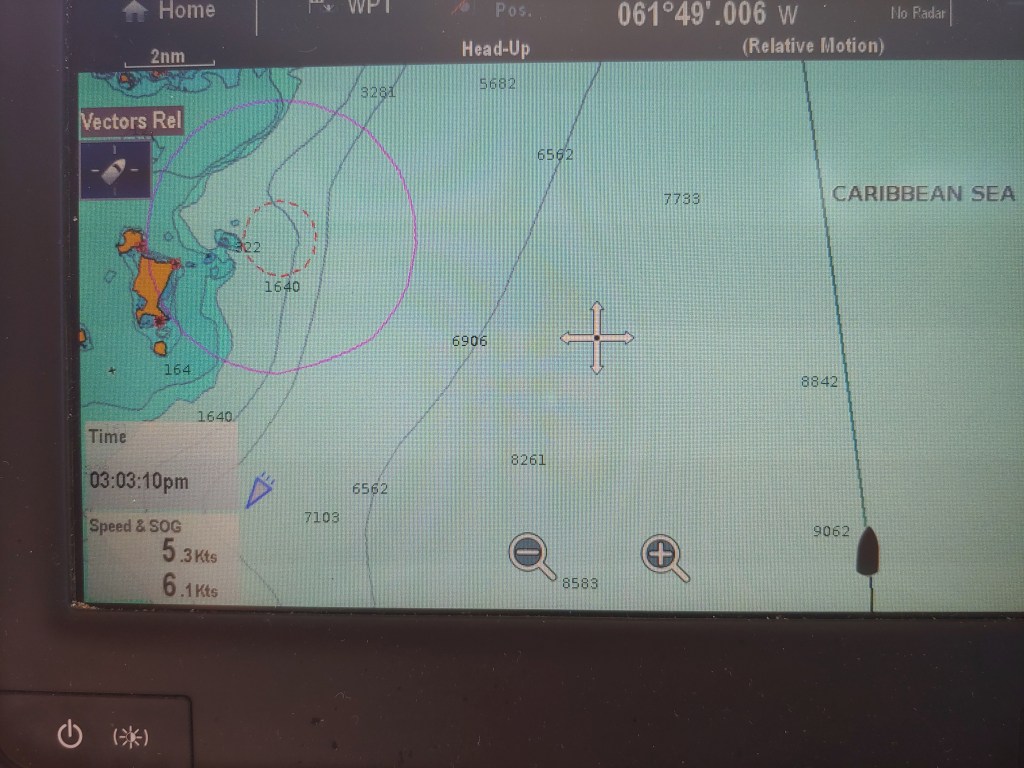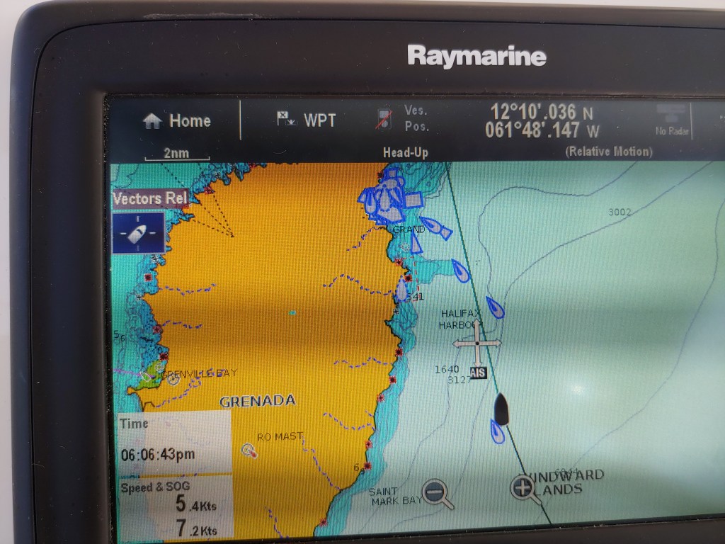 There’s an active under sea volcano just north of Grenada known as Kick-um Jenny.  Our route took us well away from it, but we were close enough for it to show up on our chart plotter.  Hopefully it stays quite for the duration of our stay.
