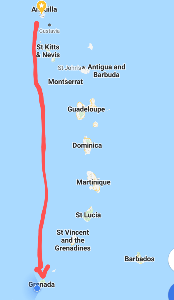 We had been given authorization to arrive in Grenada between July 1st and 3rd.  Pre Covid, we would’ve planned stops at the many beautiful islands along the way. But due to quarantine restrictions, that option was, for the most part, no longer available to us.  We had requested and were granted approval to stop at Guadeloupe or Martinique if we felt we needed to for any reason but, since we wouldn’t be allowed to get off the boat, our plan was to sail straight to Grenada.  The trip from St Martin would be around 370 nautical miles.  We normally calculate our speed at 5 knots, so we figured 75 to 80 hours total.  This would be our second longest non-stop trip ever, the first being the Gulf of Mexico.