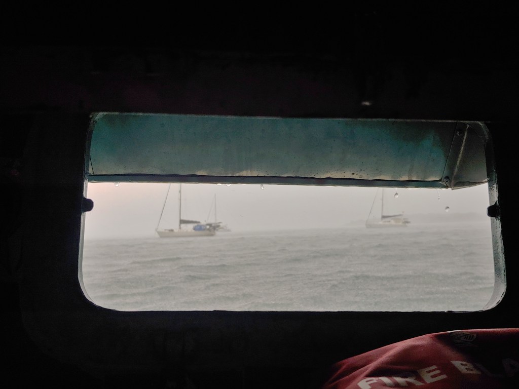 We decide to stay put and prepare the boat.  We pulled the jib sail down and since it needed some repairs, dropped it off at the sail loft.  We tied down the main and mizzen sails. We put out extra chain on our anchor and of course had a secondary anchor ready to deploy if needed.  We removed everything from on deck and pulled Puff up on the davits and tied her off.  Our plan for any large storm at anchor is to use the engine to take some of the stress off the anchor if necessary so Russell also checked the engine over carefully.