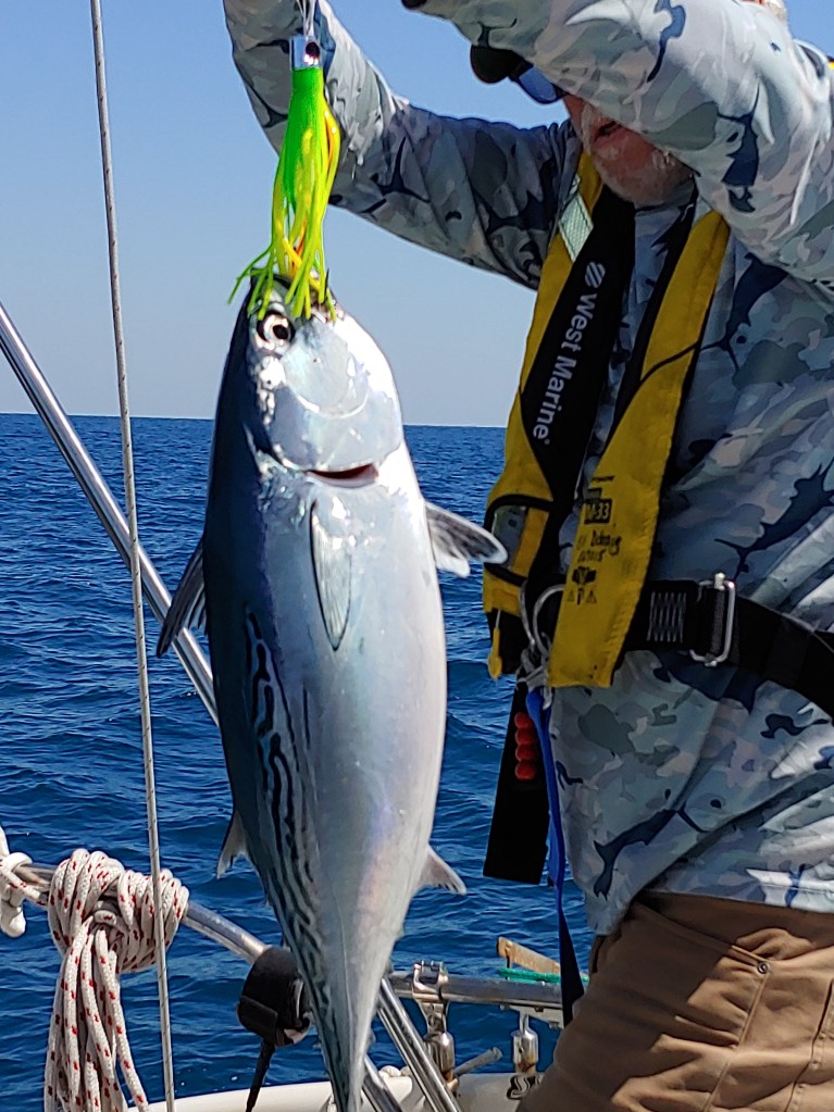 Saturday was a beautiful sunny day of motor sailing.  We put out a lure and within a short period of time  caught our very first fish, a Mackerel.  Since our Florida fish ID book cautions against eating them (potential for ciguatera or parasites – YUCK) we threw it back.  Our next fish was a tuna!!! Well, it was actually a Little Tunny or Bonito which is only rated as bait fish in our trusty book so, back into the water it went.  At any rate, it was a beautiful fish.  As we got closer to Ft Myers we began so see crab pots so brought in the lure.