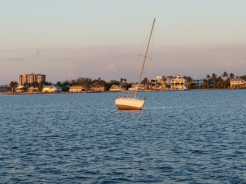 There are limited anchorages shown in the guidebooks but we choose Matanzas Pass which is directly behind Ft Myers Beach.  Since our mast is somewhere around 62 feet and the bridge clearance is 65 we planned to anchor just before the bridge.  We were coming through this very narrow channel just at sunset and the first thing I see is a sailboat laid over on its side.  Didn’t give me the warm fuzzies I have to say!  But we were able to drop our anchor in a small unoccupied spot barely outside the channel just as it was getting dark.